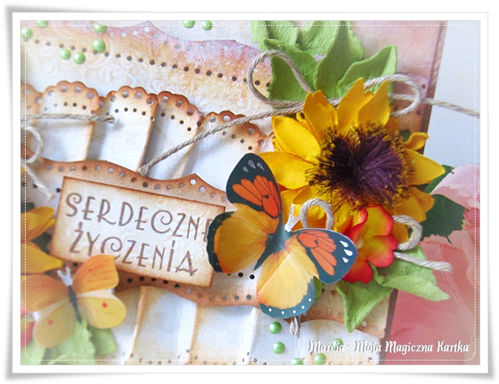 Na sam koniec weekendu, dzisiaj w roli głównej kolejna karteczka urodzinowa, pełna kwiatów – tym razem z kolekcji Venus & Mars 🙂 Uwielbiam te papiery zawsze na końcach pocieniować Distressami – efekty wychodzą niesamowicie 🙂 Motyle to ostatnio nieodłączny element na moich pracach, a sztuczne, materiałowe kwiaty wpasowały się fantastycznie w całość kompozycji 🙂