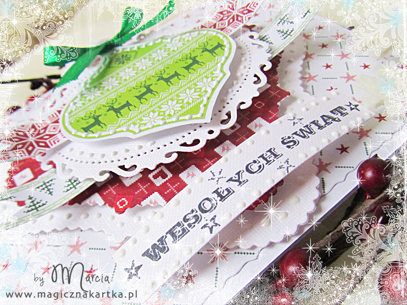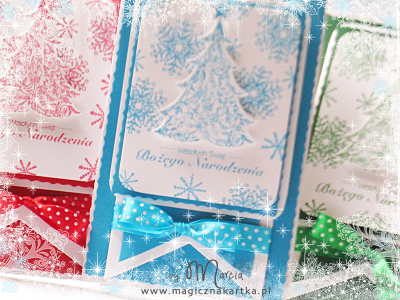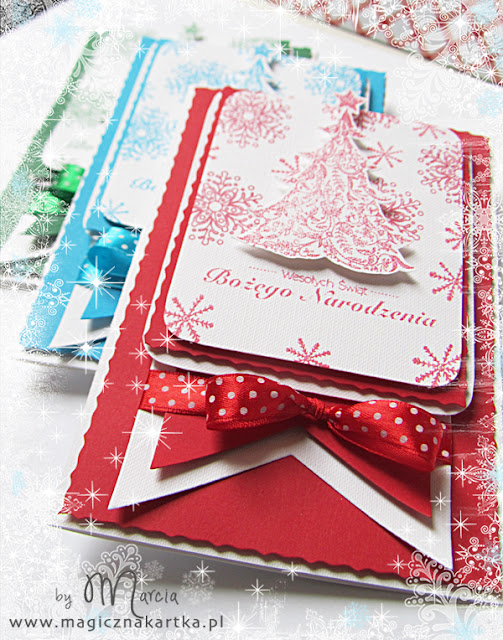 W tym roku bardzo późno, ale ja również zaczynam już sezon na świąteczne kartkowanie 🙂 Dzisiaj dość skromnie, ale kolorowo. Trzy karteczki zrobione przy pomocy tuszy i stempelków, ozdobione moimi ukochanymi tasiemkami w kropki oraz stempelek mojego autorstwa – mała inauguracja sezonu świątecznego – zapraszam 🙂