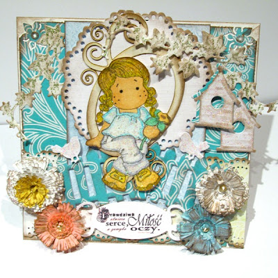 Moja interpretacja tematu to tildusiowa karteczka, bo cóż może być bardziej romantycznego jak nie ta słodka dziewczynka?? :))) Mam nadzieję, że moje kolorowanie kredkami akwarelowymi się powiodło 🙂 Dołozyłam też troszeczkę moim quillingowych kwiatuszków. Mam do tej techniki wielką słabość ale na dzień dzisiejszy nie potrafię się jeszcze przełamać. Moje kolory to morski i biały – w rzeczywistości karteczka ma bardziej żywsze kolory, i świeci się cała połyskliwym brokatem, jednak zdjęcie cykałam wczoraj wieczorkiem więc zdjęcie nie oddaję całego jej uroku 🙂 Popełniłam małą gafę ale już się poprawiam, ponieważ zapomniałam napisać że piękny digi stempelek zapożyczyłam sobie od Asi3city za co bardzo serdecznie jej dziękuję 🙂