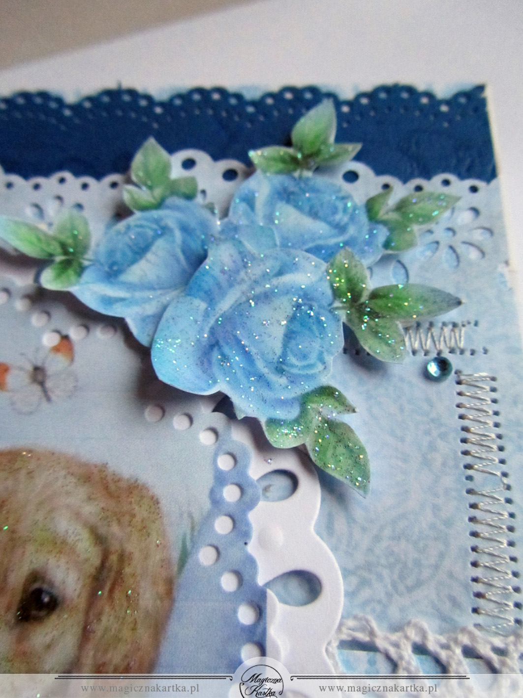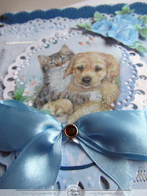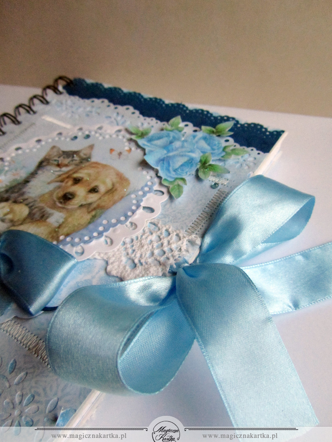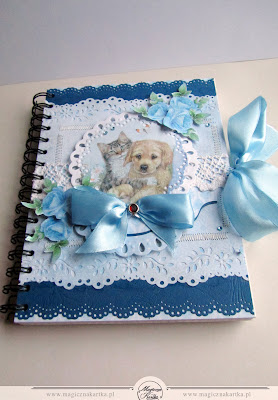 Niebieski pamiętnik z pieskiem i kotkiem powstał ze ślicznych błękitów, kolekcji Galerii Papieru – „Usłane Różami” – mojej ulubionej 🙂