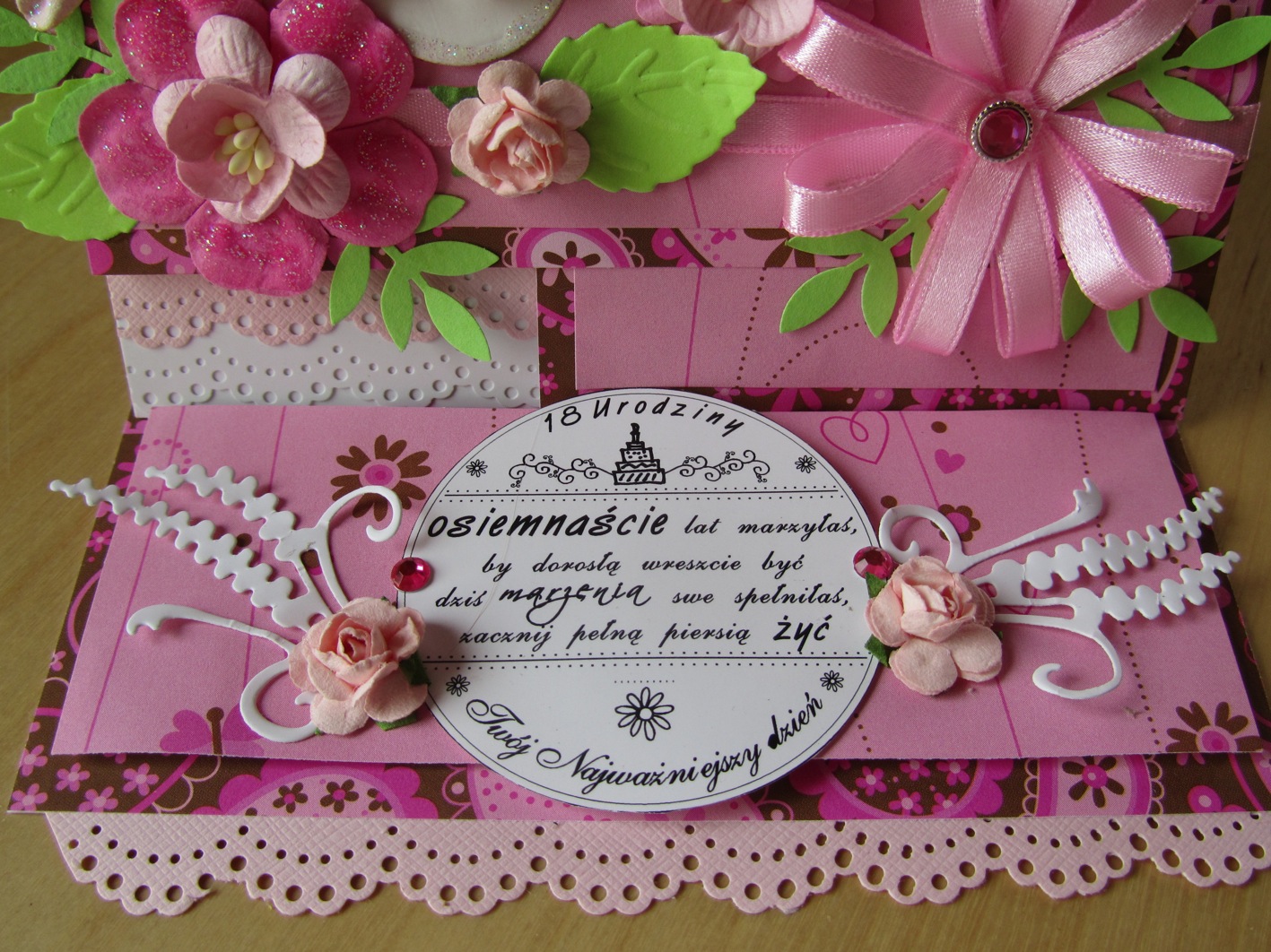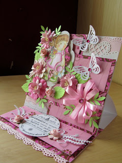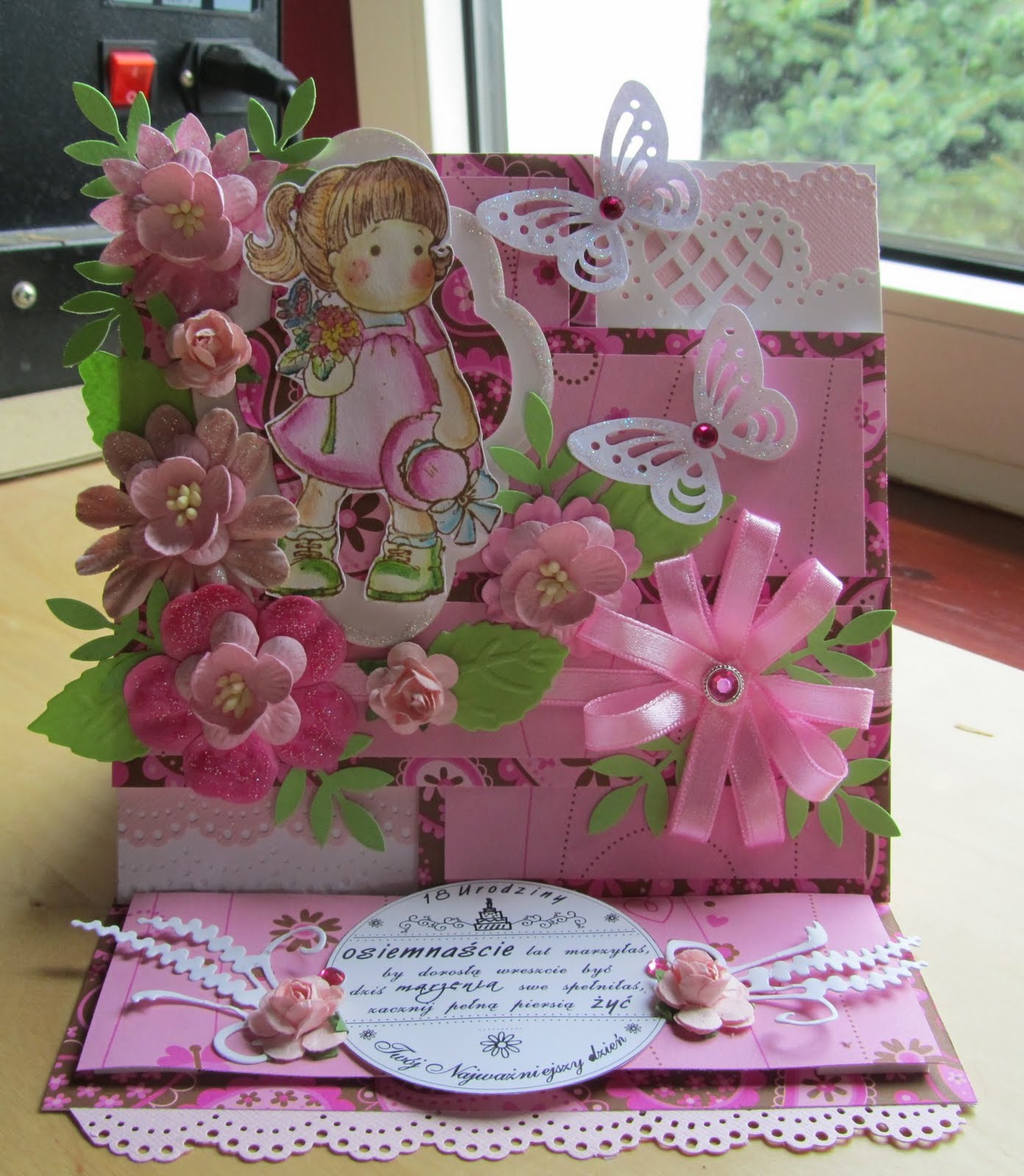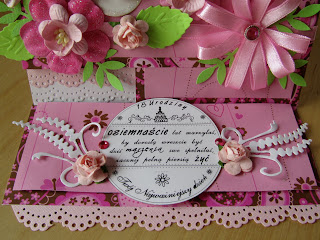 Jako że moja maszynka do wycinania przechodzi zabiegi modernizacyjne (zmienia się w maszynkę elektryczną ;))), karteczka jest dosyć prosta i powstała głównie przy użyciu dziurkaczy. Papier podkładowy zrobiłam sobie sama przy użyciu białego tuszu i stempelka kwiatkowego.