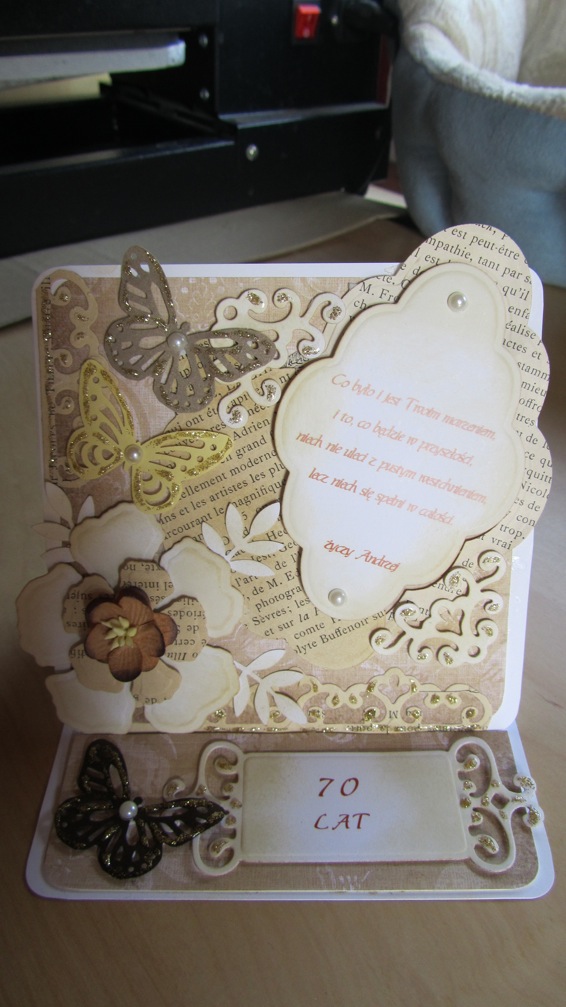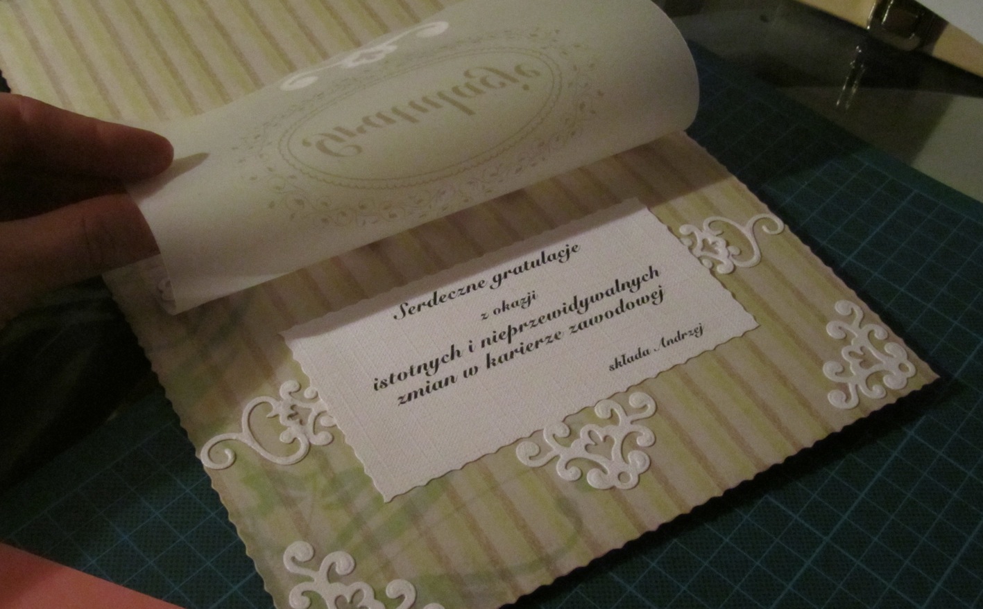 Dość długo myślałam nad zrobieniem tej kartki. Docelowym odbiorcą ma być Pan na stanowisku dyrektorskim. Jej założeniem miała być ogromna elegancja, bez żadnych kwiatów i motyli oraz słodkości, które tak uwielbiam w swoich pracach. Mam nadzieję, że mi wyszła i że się spodoba 🙂