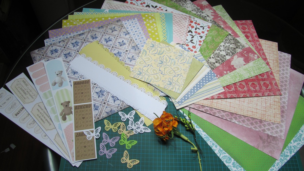 Justynka podarowała mi przepiękne papierki których nie mam zbyt wiele, oraz wspaniałe wycinanki motyli i borderów ze swoich dziurkaczy – dziękuję Ci bardzo Justynko raz jeszcze i nie martw się – to że nawycinałam sobie od Ciebie z 50 motyli, nie znaczy, że to koniec naszych spotkań :)))