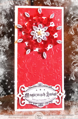 Przy tworzeniu tych trzech świątecznych kartek, nie korzystałam z żadnych książek czy tutoriali – po prostu przypatrzyłam się na zdjęcie w googlach i powstały dwie śnieżynki, potem w myślach powstała quillingowa choinka, z której jestem bardzo ale to bardzo dumna 🙂