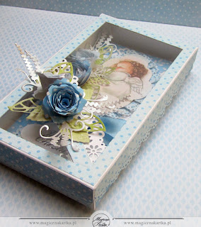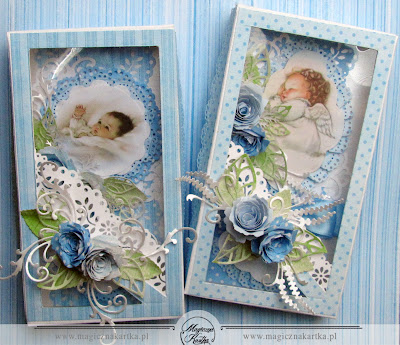 Dzisiaj będzie dość krótko, bo gonią mnie kolejne prace a ręce rwą się do roboty 🙂 W długi weekend, pomiędzy moją pracą na etacie a wolnymi wieczorami, powstały dwie karteczki z okazji Chrztu Świętego dla dwóch zapewne uroczych chłopców 🙂 Do obu włożyłam tyle samo serca i pracy, obie są niebieskie i obie zawierają pudełeczka – takie prawie bliźniaki 🙂 Za obrazki na karteczkach bardzo dziękuję koleżance ze społeczności Scrappassion – Gosi F 🙂
