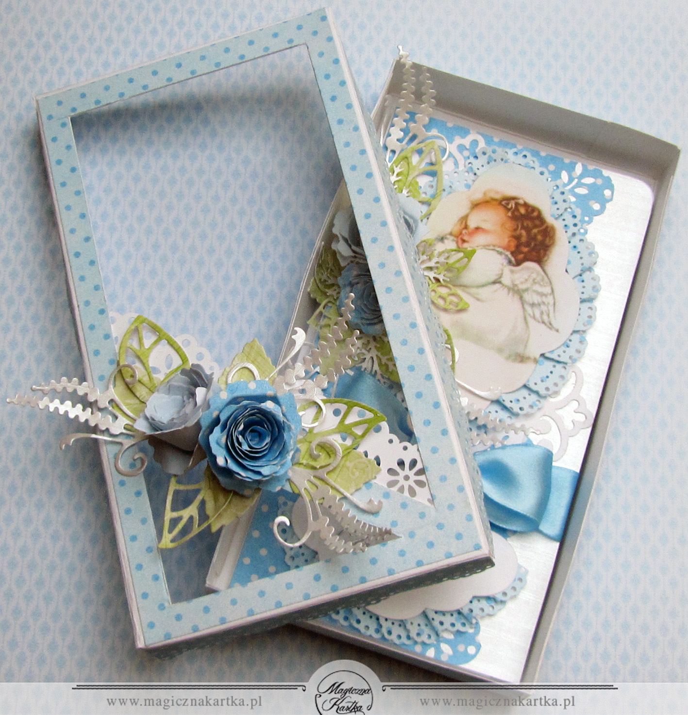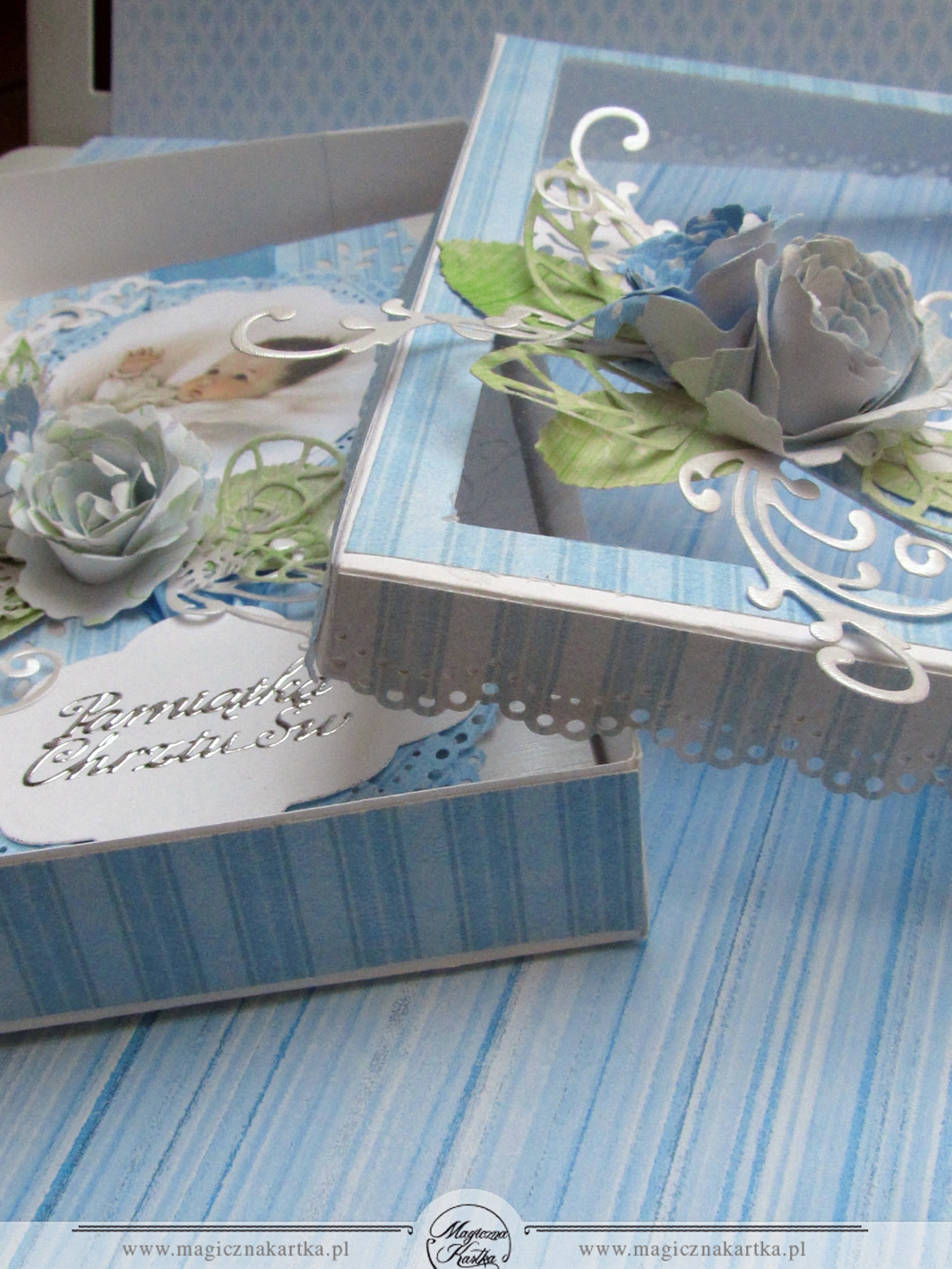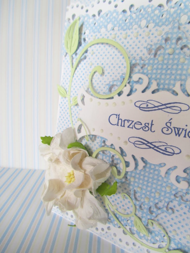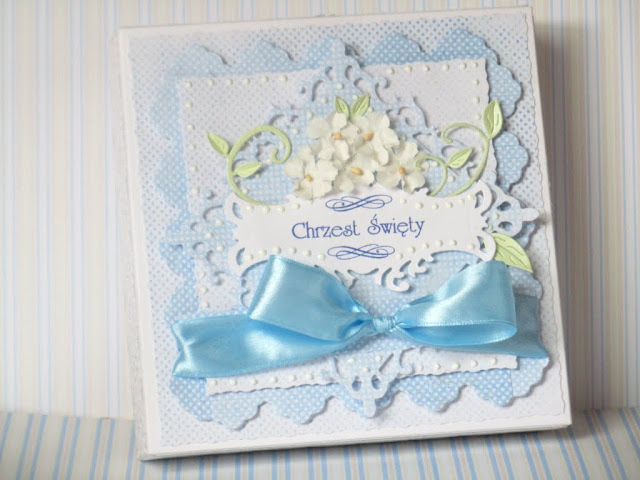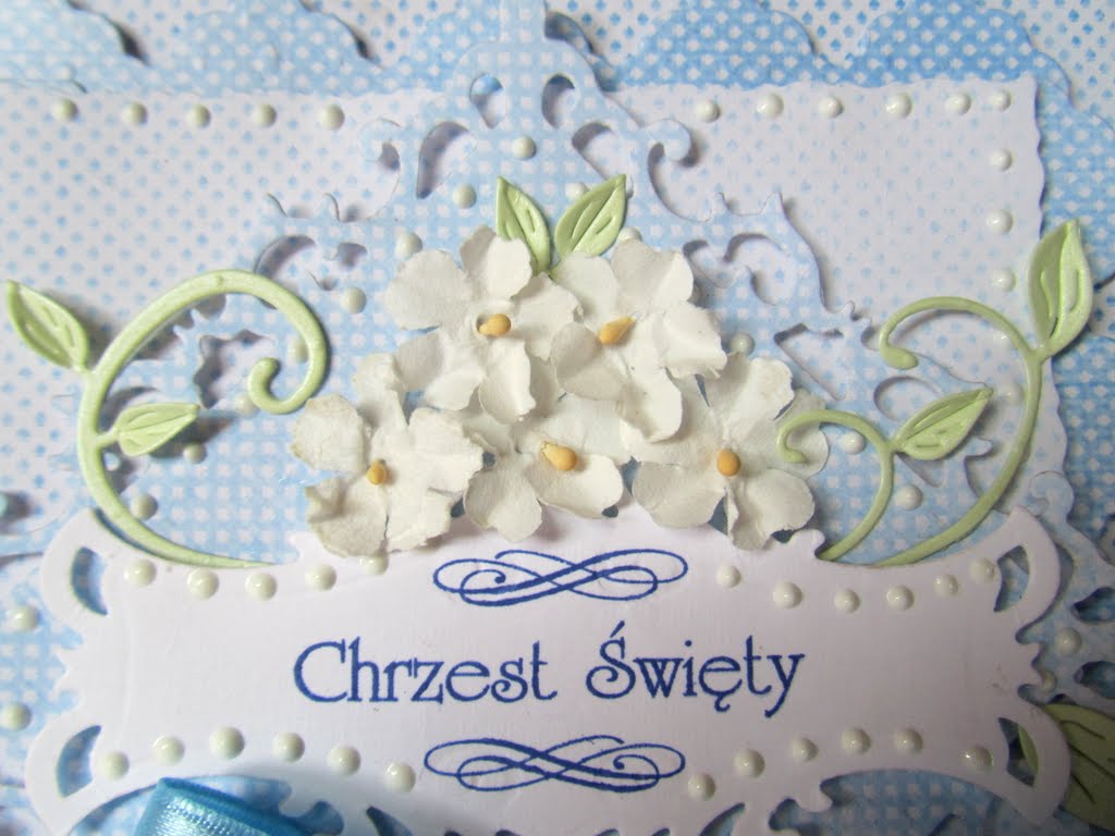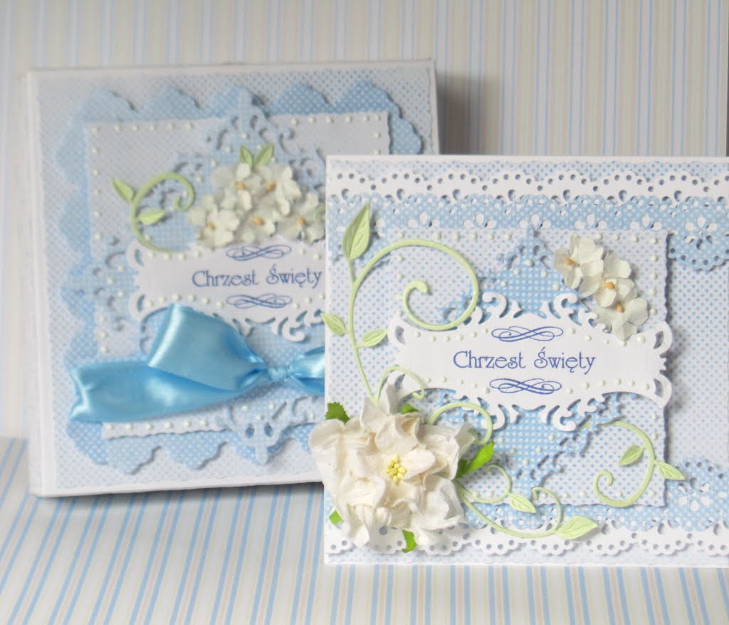 Dzisiaj będzie dość krótko, bo gonią mnie kolejne prace a ręce rwą się do roboty 🙂 W długi weekend, pomiędzy moją pracą na etacie a wolnymi wieczorami, powstały dwie karteczki z okazji Chrztu Świętego dla dwóch zapewne uroczych chłopców 🙂 Do obu włożyłam tyle samo serca i pracy, obie są niebieskie i obie zawierają pudełeczka – takie prawie bliźniaki 🙂 Za obrazki na karteczkach bardzo dziękuję koleżance ze społeczności Scrappassion – Gosi F 🙂