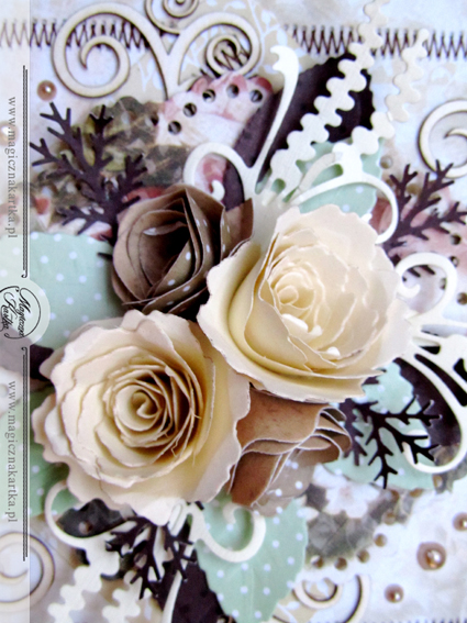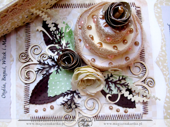 W prezencie stworzyłam takie oto ażurowe pudełeczko z ażurowym tortem w środku 🙂 Powstało ono w całości z papierów Galerii Papieru „Usłane Różami – 02” oraz kilka elementów z papierków „Kapuśniaczek”. Naprawdę kocham te dwie serie papierów, są delikatne i można z nich wyczarować wspaniałości na różne okazje. Pudełeczko ozdabiają ażurowe koronki, bordery z dziurkacza brzegowego Marthy Stewart – Floral Vine, moje ukochane kwiatuszki do zwijania z wykrojników Marianne Design – Angielskie Róże oraz najnowszy, w 100% trafiony nabytek różyczka Sepllbinders – Spiral Blossom One – wierzcie mi, wykrojnik jest warty swojej strasznie wysokiej ceny 🙂 Detale to elementy florystyczne Marianne Design i zawijaski z Wycinanki.