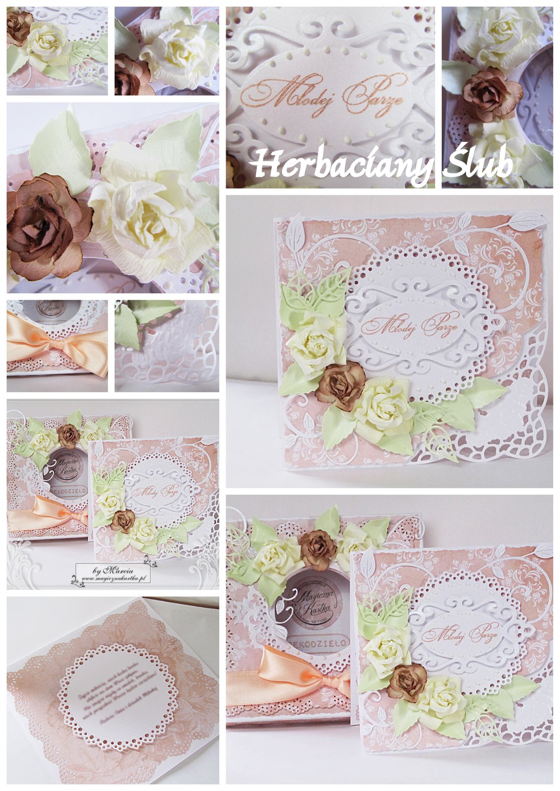 U mnie sezon ślubny w pełni 🙂 Cała pracownia zasypana różami i najjaśniejszymi odcieniami papierów i dodatków 🙂 Dzisiaj przedstawiam kolejny komplecik ślubny – tym razem w odcieniach herbacianych, brązach i jasnych beżach 🙂 Zapraszam na fotorelację 🙂
