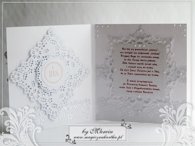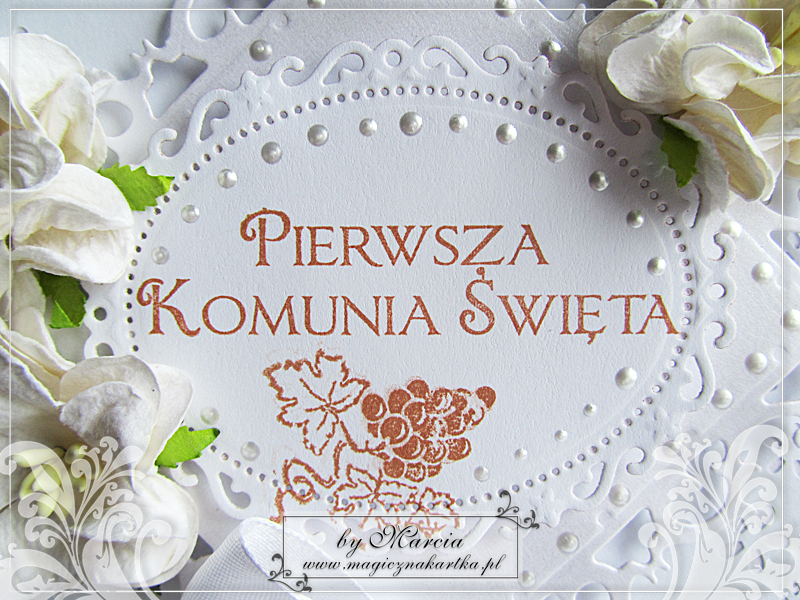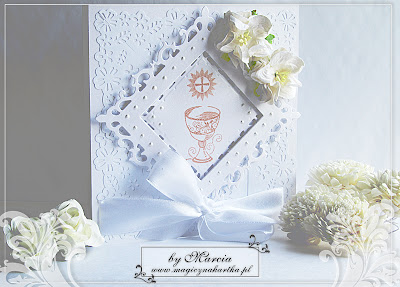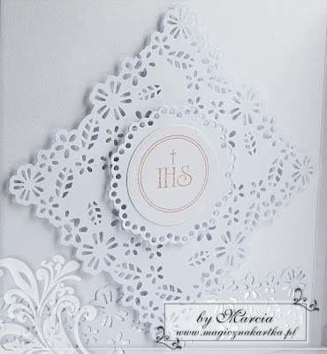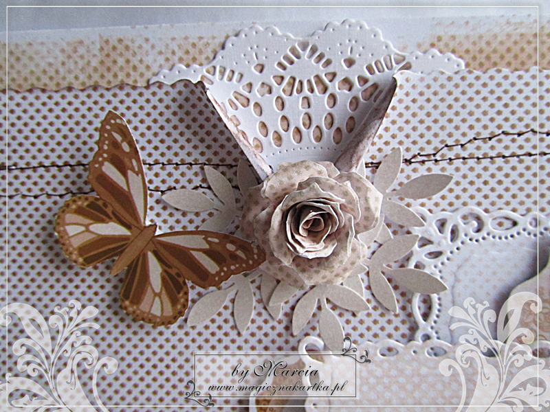 piękny zestaw dziurkaczy Marthy Stewart – Wild Flower (to ten dziurkacz z którego powstało tło – wierzcie na słowo, że wzór z tego dziurkacza jest jeszcze piękniejszy na żywo 🙂 , dziurkacz wstęgowy Martha Stewart – Doily Lace Trim oraz wykrojnik Spellbinders – Squares Fleur de Lis.
