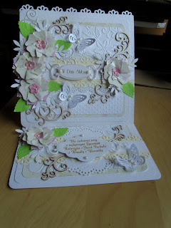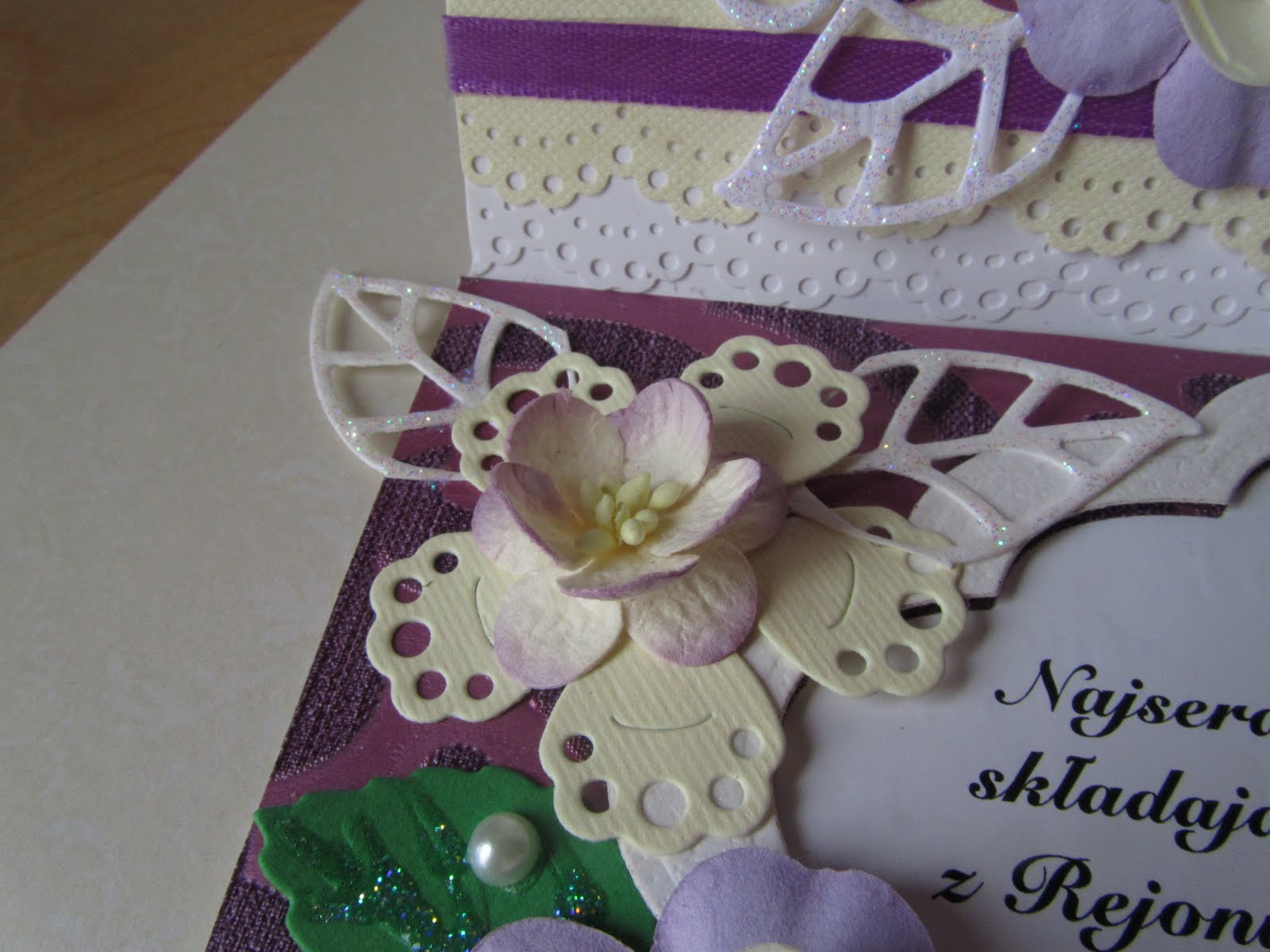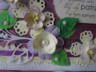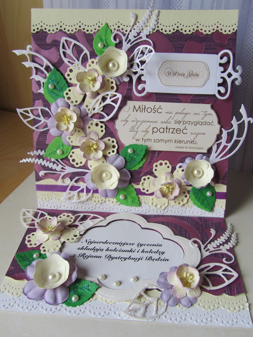 Z okazji Dnia Ślubu dla młodej pary – taka oto karteczka, także sztalugowa, ale tym razem na fioletowo (naprawdę polubiłam ten rodzaj kartek). Dużo w niej moich ulubionych ozdóbek kwiatowych i wykrojników Marianne Design oraz brokatu. Mam nadzieję, że się spodoba.