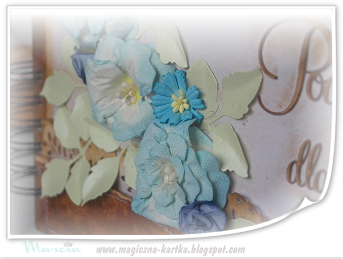 Każdą kartkę albumu oraz okładkę skrzyni i albumu obszywałam. Dodałam kwiatuszkowe tekturki i podkleiłam każde zdjęcia w trzech identycznych albumach….