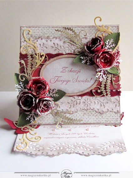 A poniżej dwie karteczki urodzinowe w moim wydaniu. Obie karteczki z okazji 50-tych urodzin. Pierwsza z embosowanymi śnieżno-czerwonymi różyczkami – dla kobiety, stworzona z papierów Primy – delikatna, ażurowa z pudełeczkiem i wstążką do kompletu.